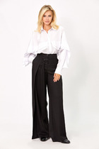 Блузка женская свободного покроя, удлиненная, с рубашечным рукавом на манжете по низу, по переду на уровне груди - накладной карман, застежка спереди на планку с пуговицами, воротник рубашечный на стойке, низ изделия фигурный, с закругленными разрезами по боковым швам.