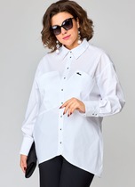 Блузка женская прямого силуэта выполнена из блузочной ткани с добавлением эластана, с отрезным карманом на одной полочке и отрезной планкой на другой. Застежка центральная на петли и пуговицы, воротник рубашечного кроя. Длина блузки по спинке 80 см, рукава 50 см.