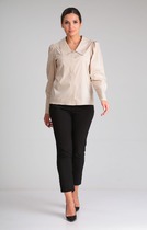 Блузка женская полуприлегающего силуэта из эко-кожи. Застежка центральная на притачных планках с пробивными кнопками. Воротник на стойке. По переду обработан накладной карман с декоративной тесьмой и клапан. В боковых швах – разрезы. Рукава втачные, двухшовные, длинные, по низу рукавов притачные манжеты.