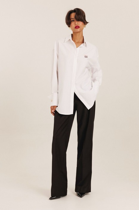 Блузка женская "оверсайз" прямого силуэта. Воротник отложной на стойке. Рукав спущенный с притачной широкой манжетой с отворотом. Разрез рукава обработан планкой. Застежка по переду потайная, на пробивные петли и пришивные пуговицы.