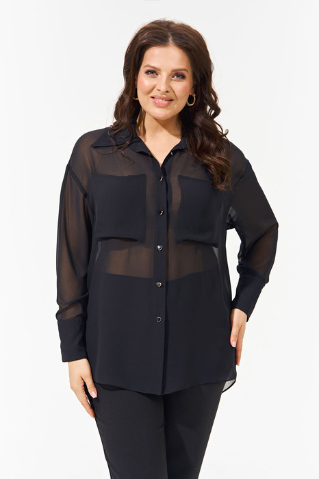 Рубашка-накидка женская свободного силуэта выполнена из легкого просвечивающегося шифона. Рукава со спущенной линией плеча на манжетах, по переду накладные карманы, застежка на петли и пуговицы. Рубашка соответствует заявленному размеру. Пользуйтесь, пожалуйста, таблицей измерений готового изделия.