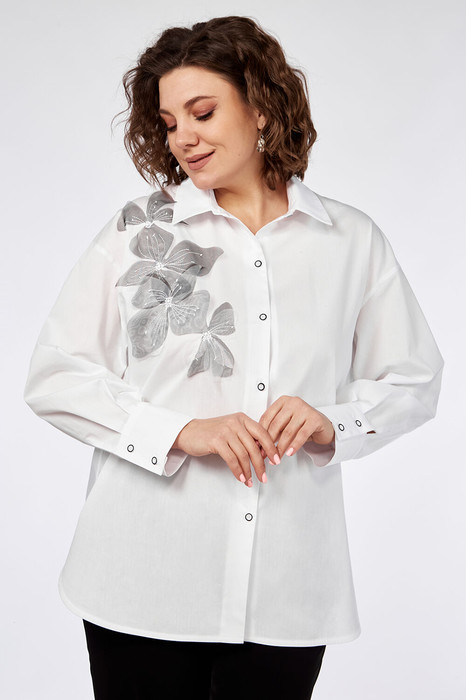 Блузка женская свободного силуэта из блузочной ткани. Воротник стояче-отложной, застежка на петли и пуговицы. На спинке кокетка и складка. Плечо спущенное, рукав длинный со складками, внизу высокий манжет с застежкой на петли и пуговицы. Блузка с фигурной линией низа. Декор — вышивка-аппликация из органзы.