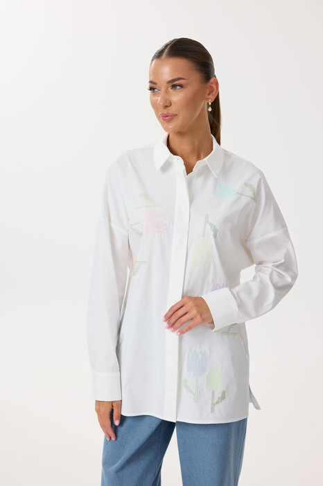 Блузка женская прямого силуэта. Перед с центральной застежкой на петли и пуговицы, декорирован авторской вышивкой. Спинка с кокеткой. Плечо спущено. Рукав длинный одношовный, по низу со складками. Низ рукава обработан притачной манжетой, застегивающейся на петли и пуговицы. В боковых швах обработаны разрезы. Горловина обработана воротником рубашечного типа с отрезной стойкой.