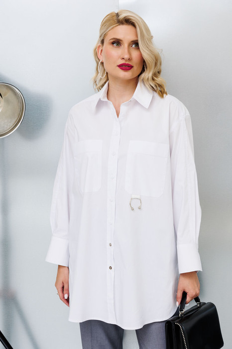 Удлиненная блузка свободного кроя. по переду расположены накладные карманы. Под одним из них находится металлическое полукольцо. рукав длинный, застежка на пуговицы комбинированных цветов.