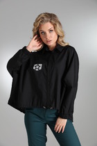 Блузка женская большого объема, прямого силуэта. На детали спинки расположена двойная кокетка, переходящая на деталь полочки. Под кокеткой на спинке встречная складка. Воротник рубашечный отложной на стойке. Застежка планка центральная на прорезные петли и пуговицы. Линия плеча спущенная, рукав рубашечный, длинный. В нижней части рукава заложены складки, заканчивается манжетой с двумя прорезными петлями и пуговицами. Разрез рукава обработан планкой. Низ блузки разноуровневый: спереди короче, сзади длиннее. Длина изделия до середины бедра.