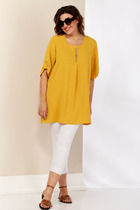 Стильная рубашка свободного кроя с цельнокроеной кокеткой полочки и спинки, со спущенной линией плеча. Модель прямого силуэта, c рубашечным воротником и рукавом на манжете. По переду рубашку украшают накладные карманы с декоративными элементами. Линия низа фигурная. Низ изделия обработан окантовкой. По спинке заложена и застрочена бантовая складка. По переду блузы планка на пуговицах.