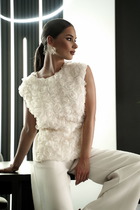 Стильная рубашка свободного кроя с центральной планкой на застежку петли-пуговицы и накладными карманами по переду. Плечо изделия спущено. Рукав 7/8 прямой с широкой манжетой. Воротник со стойкой. Спинка изделия цельная. Низ изделия фигурный отстрочен отделочной строчкой.