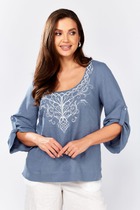 Стильная рубашка свободного кроя с ассиметричной центральной планкой на застежку петли-пуговицы. Рукав короткий. Спинка изделия с кокеткой и складкой. Низ изделия фигурный.
