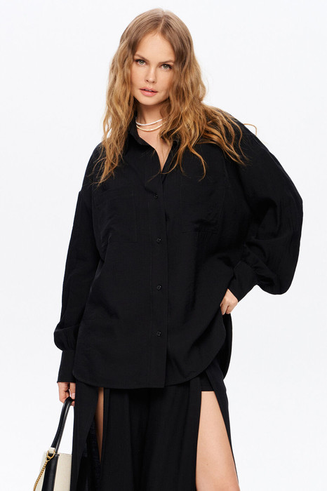 Детали: рубашка прямого силуэта, спущенная линия плеча, застежка на петли и пуговицы, длинные рукава с притачными манжетами, фигурный низ.