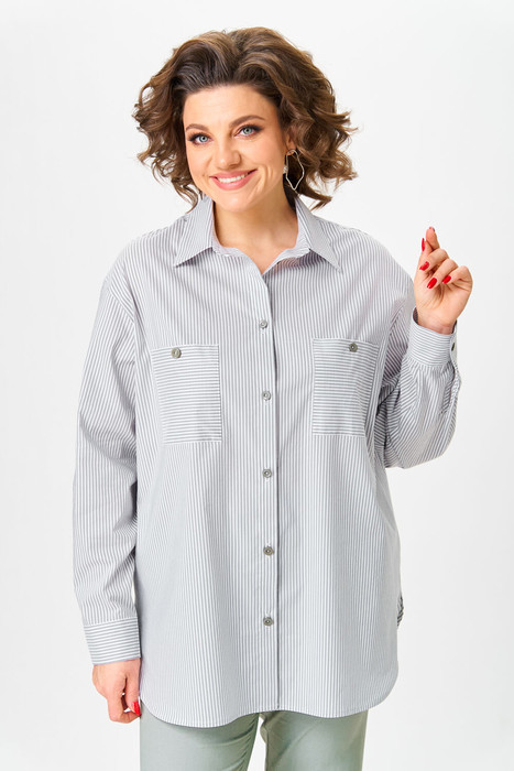 Блузка женская свободного силуэта выполнена из легкой хлопковой ткани. Горловина с отложным воротником на стойке. Застежка центральная на петли и пуговицы. Спереди в верхней части накладные карманы. Спинка с кокеткой и складкой из-под кокетки. Плечо спущенное, линия поймы углубленная. Рукава длинные на манжете, с застежкой на петлю и пуговицу. Линия низа блузки фигурная.