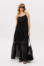 Сарафан в длине мини, А-силуэта, лиф обработан по форме американской проймы. по центру переда обработана разрез, декорированный пришивным декором в виде бантов. по лифу обработаны нагрудные вытачки. застежка на потайную молнию по центральному шву спинки. по перед низ платья обработан невысоким разрезом сбоку
