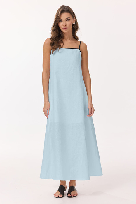 Сарафан льняной А-образного силуэта без рукавов на регулируемых бретелях из льняной окантовки контрастного цвета. Полочка и спинка с рельефами и карманами в боковых швах. Вырез горловины и проймы окантованы из льна контрастного цвета. Сарафан на подкладке из хлопковой ткани.