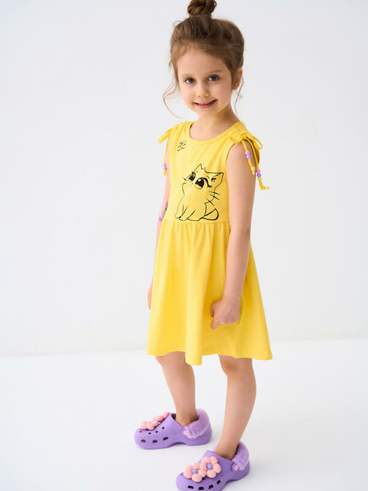 Сарафан детский для девочки. Выполнен из хлопкового трикотажа джерси. Вместо обычных плечевых швов — завязки, украшенные яркими бусинами. Юбка со сборкой по талии - красиво расширяется к низу. Спереди — милый принт с котенком, бабочкой и надписью, а на талии — объёмный декоративный цветок.