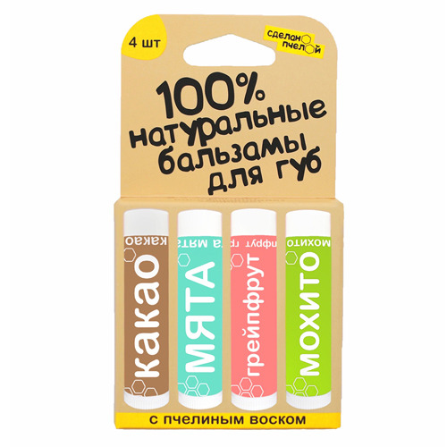 СДЕЛАНО ПЧЕЛОЙ Набор бальзамов для губ Мята+Грейпфрут+Какао+Мохито