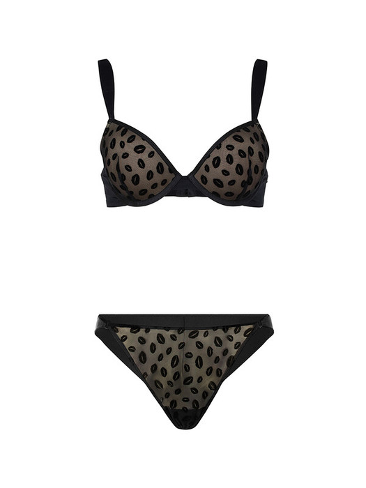 Передняя часть трусиков Brazilian выполнена из сетки с флок-принтом "поцелуй",задняя часть из двойного полотна. Мягкие резинки по талии и краю ножек спереди.Передняя и задняя часть трусиков соединены небольшим колечком. Ластовица из хлопка
