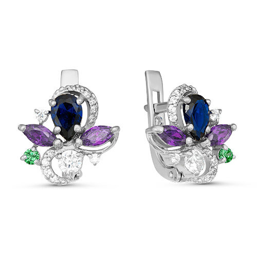 Серебряные серьги с фианитами цвета изумруд, аметист и сапфир 029