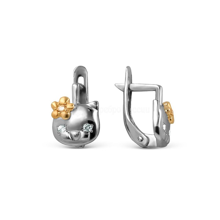 Серьги детские из серебра с фианитами и позолотой родированные - Кошки