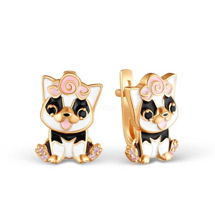 Серьги детские из золочёного серебра с эмалью и фианитами - Собачки