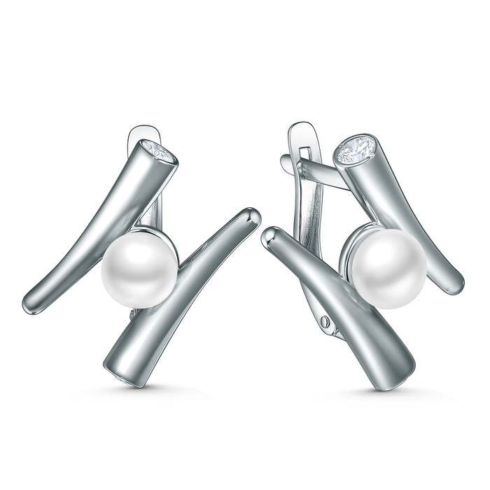 Серьги из серебра с культивированным жемчугом и фианитами родированные 221-10-33