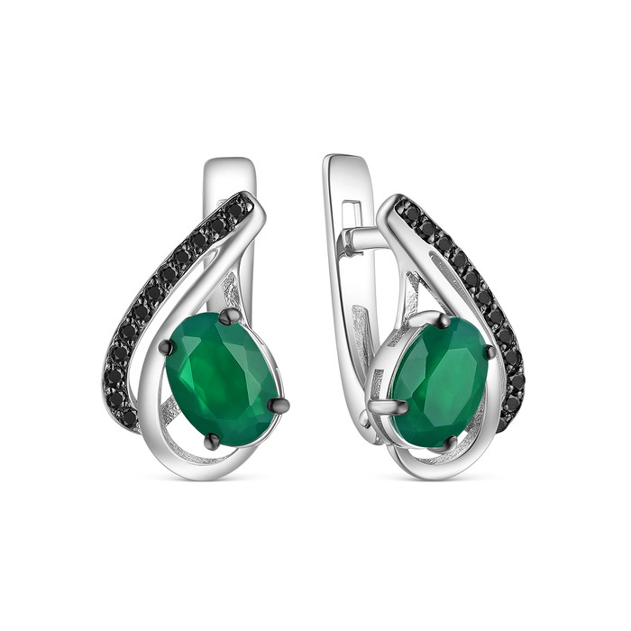 Серьги из серебра с натуральным зелёным агатом и фианитами родированные 925 проб