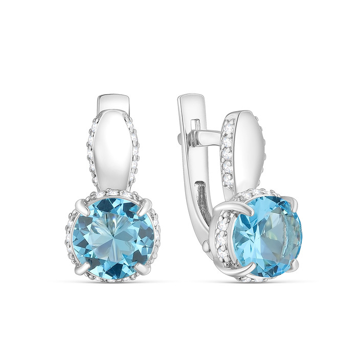 Серьги из серебра с плавленым кварцем цвета Sky Топаз и фианитами родированные 9