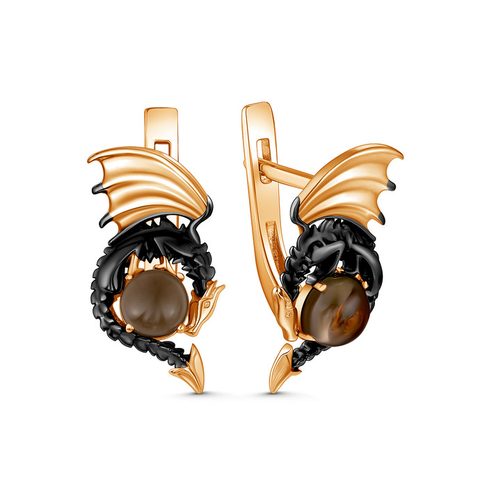 Серьги из золочёного серебра с раухтопазом и родированием - Драконы 925 пробы 2-