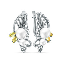 Серьги из серебра с жемчугом Сваровски, плавленым кварцем и фианитами родированн