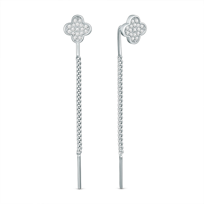 Серьги-продёвки клевер четверолистник из серебра с фианитами родированные 925 пр