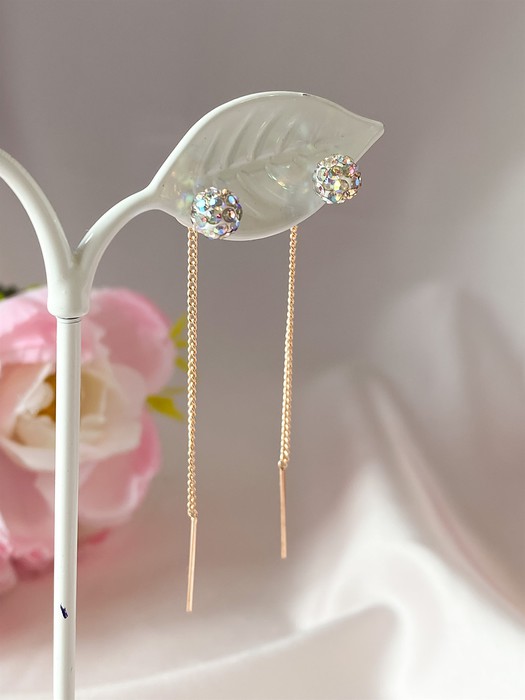 Аккуратные серьги-продевки из дубайского золота с шариками, усыпанными белыми кристаллами Сваровски. Кристаллы очень ярко переливаются на свету всеми цветами радуги.