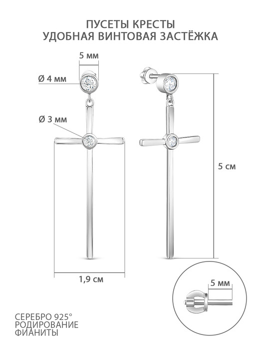 Серьги-пусеты длинные из серебра с фианитами родированные - Кресты 925 пробы 12-