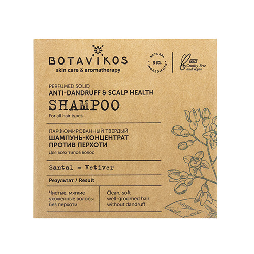 Твердый шампунь-концентрат на мягкой моющей основе из ПАВ растительного происхождения деликатно очищает волосы и кожу головы, продлевает ощущение чистоты и свежести. Действие активных ингредиентов в составе направлено на устранение причины появления перхоти, заботе о состоянии кожи головы и волос. Экстракты череды и корня аира балансируют состояние кожи головы, тонизируют, способствуют устранению перхоти и зуда, увлажняют волосы.
