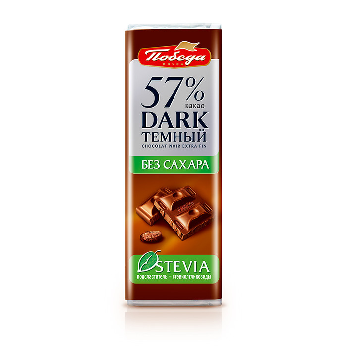 В этом авторском рецепте темного шоколада «Победа» без сахара 57 % какао тертого и какао-масла, натуральная ваниль и натуральный сахарозаменитель стевиолгликозид. Стевиолгликозид – очищенный экстракт растения стевии (Stevia rebaudiana), который придает листьям сладкий вкус. Растение стевия родом из Южной Америки. Это уникальный природный сахарозаменитель, не имеющий аналогов, благодаря особенной сладости и натуральному происхождению. С шоколадом «Победа» без сахара придерживаться ЗОЖ – просто и вкусно!