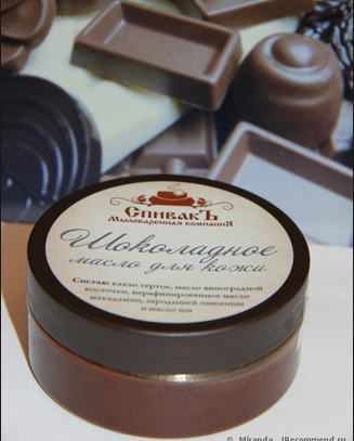 Состав: какао тертое, масло макадамии, виноградной косточки, ши, зародышей пшеницы + индивидуальные ингридиенты (указаны в скобках)