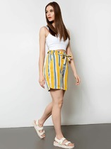 Шорты свободного кроя. Выполнены из текстильного полотна кофейного цвета в полоску. А-силуэт. Пояс на резинке. По передней части имитация застежки на 3 пуговицы. Карманы-хулиганы. По передней и задней части вертикальные швы. Длина 37 см