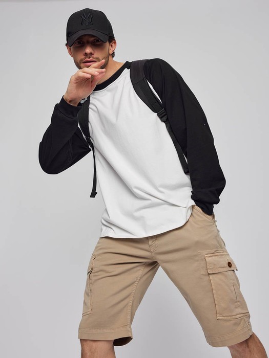 Мужские шорты-карго. Посадка Comfort fit (свободные по бедру), средняя посадка по талии спереди и высокая сзади, прямые к низу. Застежка на молнии. Шорты имеют боковые косые карманы, по бокам накладные карманы с клапаном застегивающиеся на пуговицу, сзади имитация прорезных карманов. Выполнены из слабоэластичной плотной ткани gabardine stretch. Крашение Garment dayed, т.е. покрашены в готовом виде после пошива.