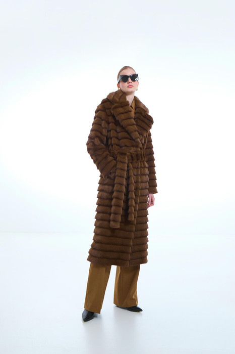Пальто женское демисезонное, однобортное, прямого силуэта, длинное. Перед с функциональными карманами «щель». Рукав длинный, одношовный. Воротник и лацкана отложные. Пальто из мехового трикотажного полотна, на подкладке, с застежкой на 3 пришивных кнопки. В комплекте пояс.