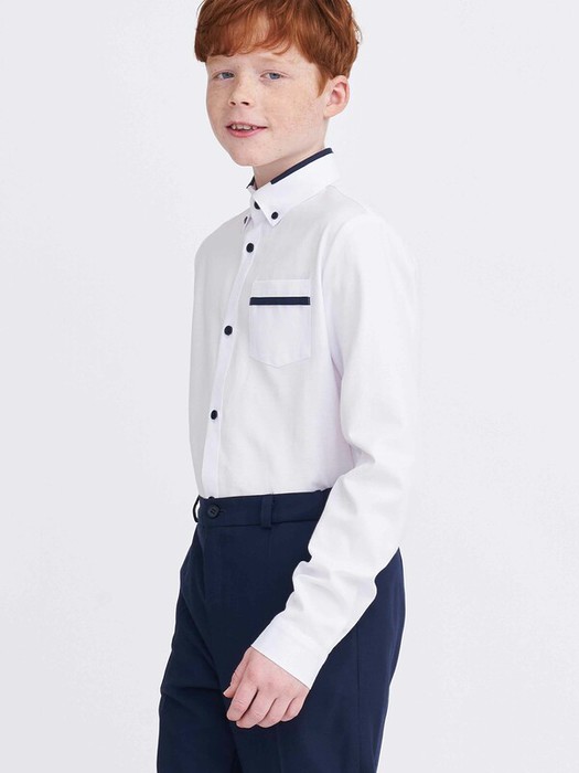 Сорочка для мальчика из смесового хлопка полуприлегающего силуэта. На левой полочке нагрудный накладной карман с отделкой декоративной полосой контрастного цвета. Воротник отложной со стойкой и декорирован полосой контрастного цвета. Застёжка по центру переда на планку  с пуговицами .Рукава рубашечные со шлицами и манжетами.