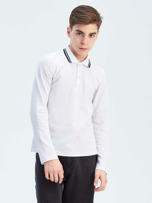 Поло из 100% хлопка с длинными рукавами, отложным воротником рубашечного типа, с центральной укороченной застежкой по переду на пуговицы. По краю воротника расположена контрастного цвета полоса.
