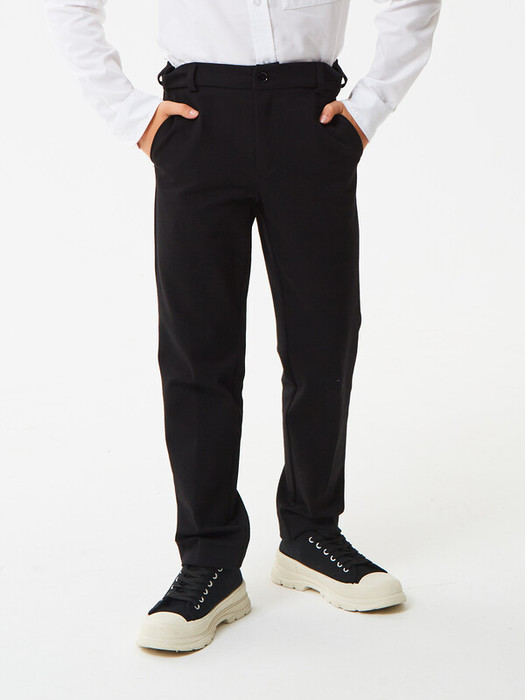 Брюки зауженные из трикотажа джерси для мальчика. Пояс с еврорезинкой сзади. На передней части брюк боковые карманы, горизонтальные защипы и застёжка - гульфик на молнии. На правой задней половинке брюк - карман с узкой листочкой. Отличный вариант на каждый день.