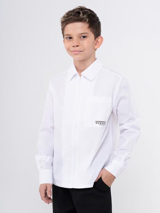 Сорочка для мальчика из смесового хлопка полуприлегающего силуэта. На спинке - кокетка. Воротник отложной со стойкой. Левая сторона полочки дополнена накладным карманом. Карман вверху декорирован принтом. Застёжка по центру переда на молнию. Рукава рубашечные со шлицами и манжетами.