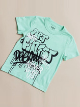 Стильная футболка для мальчика. Свободный прямой силуэт и приспущенное плечо. Модель выполнена из качественного трикотажа, который отводит влагу и подходит для активного отдыха. Спереди расположен принт в стиле граффити с текстовыми надписями. Комбинируйте футболку в ярких образах с широкими и прямыми джинсами, со спортивными брюками или шортами.