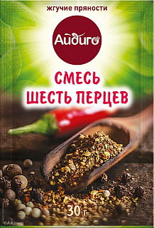 Смесь из шести перцев – уникальная приправа. В ее составе только дробленые пряные перцы, без глютамата, натрия и соли.