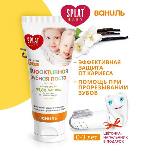 Splat бэйби 0-3 лет – Эффективная, 99,3% натуральная паста, безопасная для проглатывания, для тотальной защиты от кариеса, интенсивного укрепления эмали, заботы о деснах и снижения чувствительности во время прорезывания первых зубов. Эффективность доказана клинически.