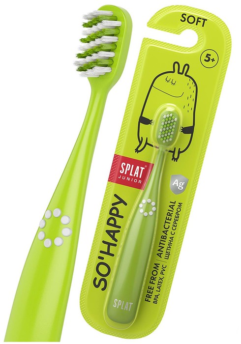 Зубная щетка Splat Junior с мягкой антибактериальной щетиной бережно очищает зубы и массирует десны. Ионы серебра в составе всех 3400 щетинок препятствуют размножению бактерий на ней.