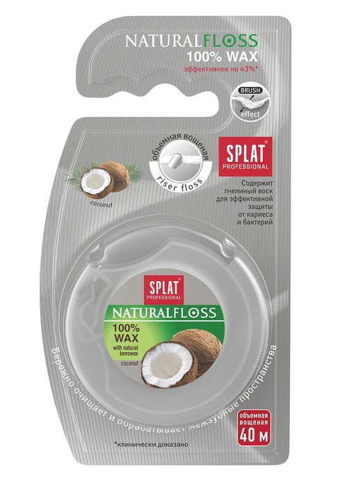 Попробуйте кокосовую новинку SPLAT — объемную вощеную зубную нить Dental Floss с натуральным пчелиным воском и ароматом кокоса! Нить пропитана антибактериальным компонентом Biosol. Поэтому она не только механически очищает межзубные промежутки от остатков пищи, но и защищает зубы от кариесогенных бактерий. Волокна нити распушаются по технологии RiserFloss во время использования и бережно обрабатывают всю поверхность зуба, даже скрытую под десной.