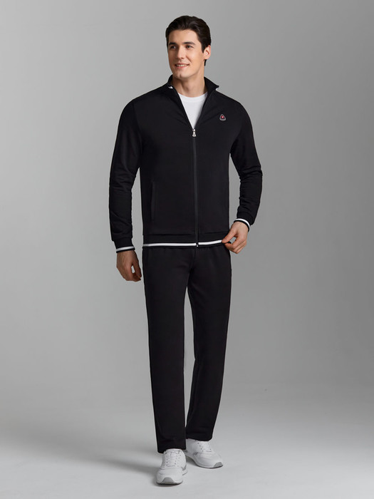 Спортивный костюм из хлопкового трикотажного полотна. Куртка прямая с воротником с фронтальной молнией. Рукава втачные. Карманы куртки прорезные . На груди куртки слева и на левой брючине под карманом - фирменный шеврон.. Воротник, манжеты и пояс куртки выполнены из полосатого эластичного трикотажа. Брюки прямые, с прорезными карманами .Пояс брюк эластичный, по линии талии дополнительно регулируется шнурком.