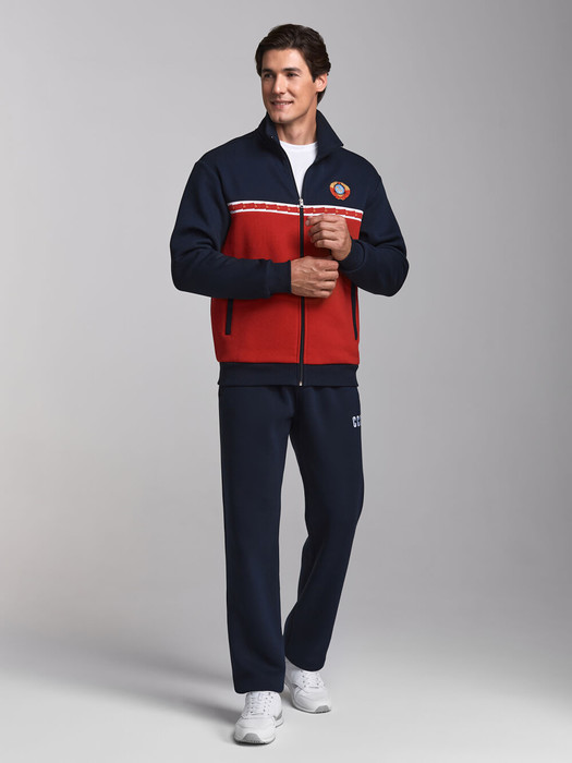 Спортивный костюм изготовлен из плотного хлопкового трикотажного полотна с изнаночным начесом. Куртка костюма на поясе, с воротником-стойкой, застегивается на молнию. Оформление костюма выполнено в символике СССР. Передняя часть куртки комбинированная – из темно-синей и красной ткани, по границе деталей настрочена белая жаккардовая лента с флагами. На левой кокетке вышивка герба СССР, выполнена цветными шелковыми нитями. На спине вышивка -аппликация СССР. Воротник, пояс и манжеты куртки изготовлены из плотной эластичной трикотажной резинки. Карманы куртки и брюк прорезные, с молниями. Брюки прямые. Пояс брюк по линии талии с эластичной резинкой, дополнительно регулируется шнуром. Под левым карманом брюк белая вышивка СССР.