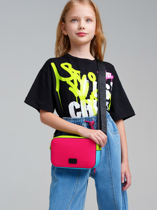 Небольшая, жесткой формы, сумка кросс-боди для девочки-подростка выполнена в стиле колор-блок. Брендированный ремень регулируется. Основное отделение на молнии, сзади - отделение для транспортной карты, внутри есть карман на молнии. Параметры: высота - 12 см, ширина -19 см, глубина - 6 см.
