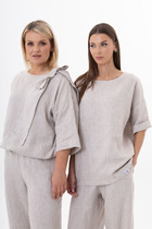 Горловина полукруглой формы, с открытым срезом, обработана притачной обтачкой из основного материала. Рукав втачной, со спущенной линией плеча и манжетой по низу.