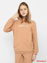 Свитшот прямого силуэта, с втачными длинными рукавами на манжетах. Изделие выполнено из разнофактурных полотен контрастных цветов, на полочке есть принт. Горловина круглая и обработана притачной планкой. Линия низа оканчивается притачным поясом. В качеств